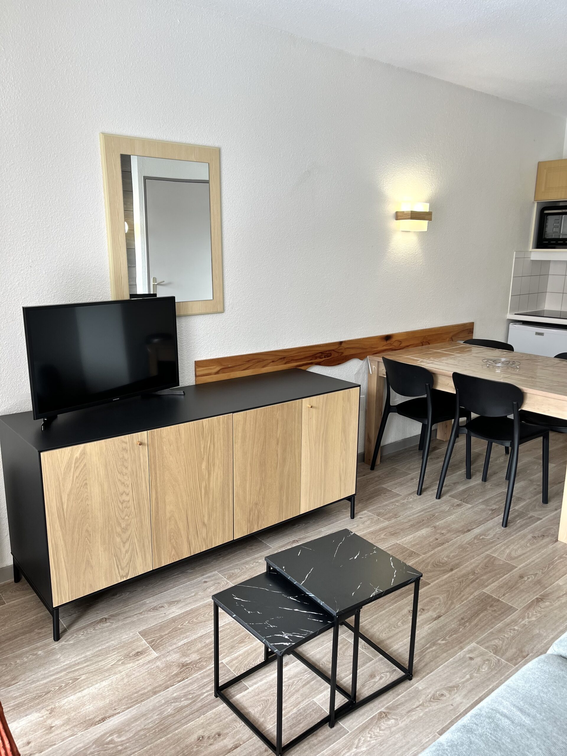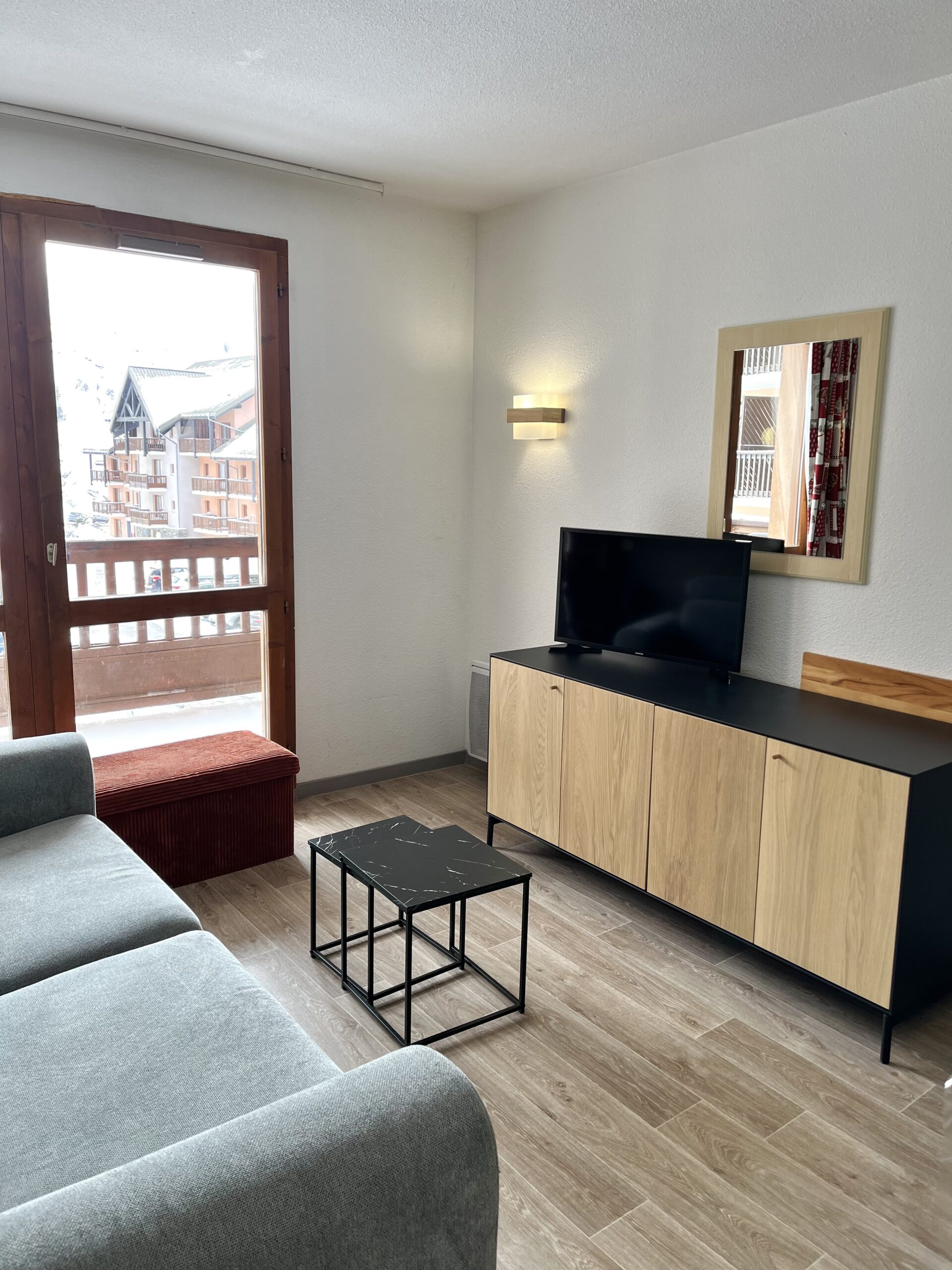 - Espace salon avec un canapé-lit (160×200), TV et accès au balcon